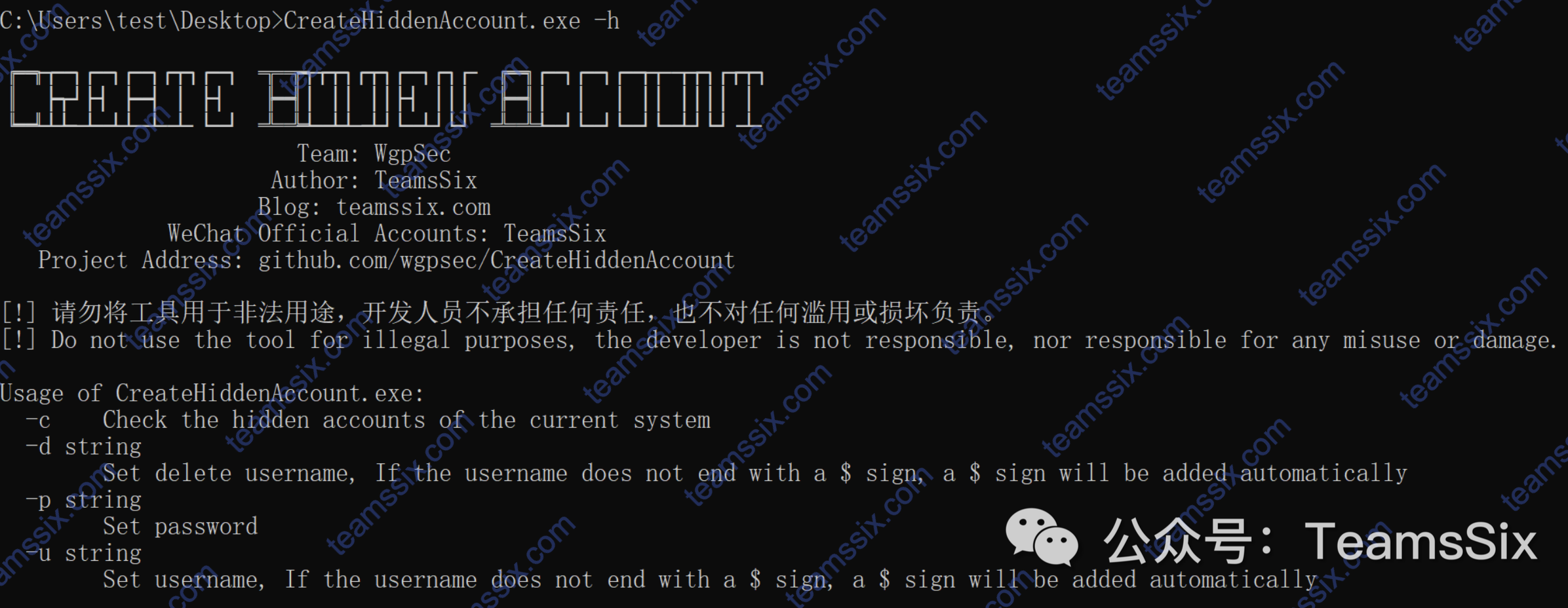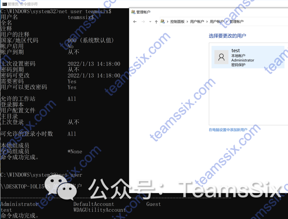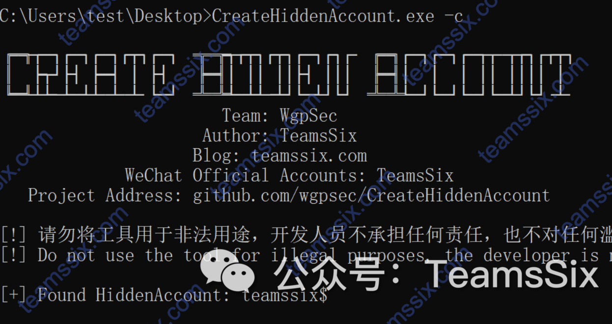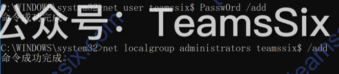 例如这里添加一个用户名为 teamssix 的隐藏账号,工具会自动在用户名后添加 $ 符,因此创建后的用户名为 teamssix$