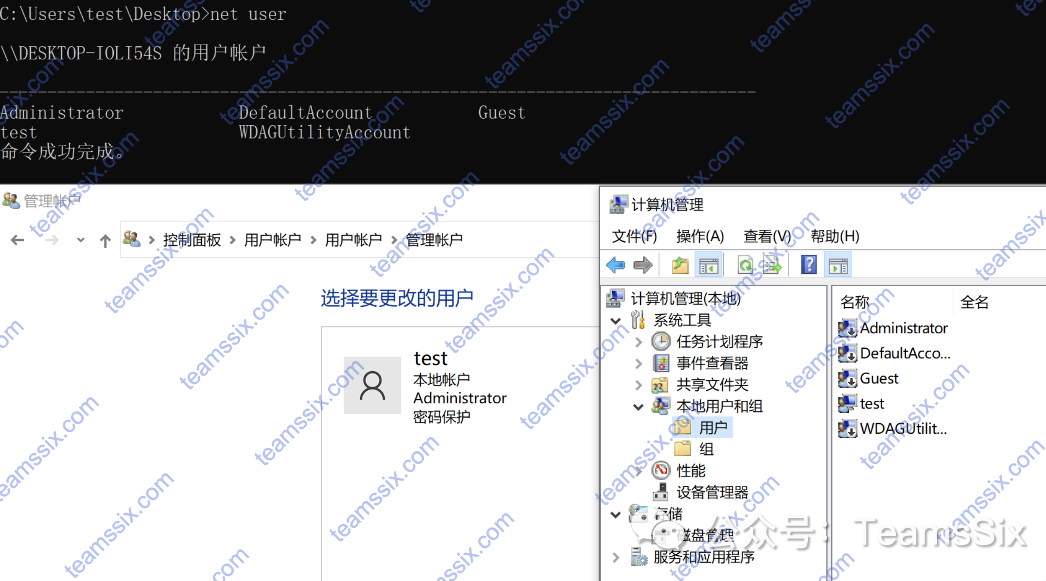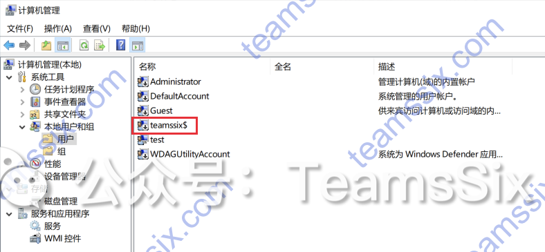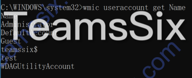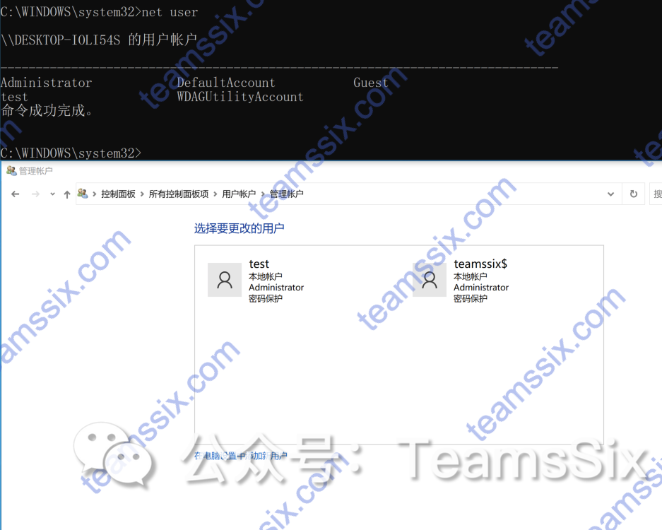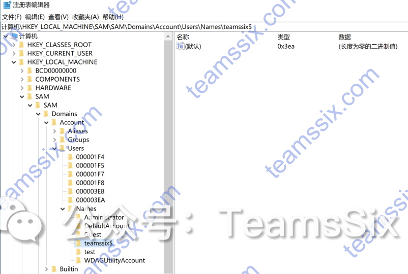 不过这种方法依然是有破绽的,比如在注册表里还是能发现 teamssix$ 用户的,使用 wmic 也能看到该用户。