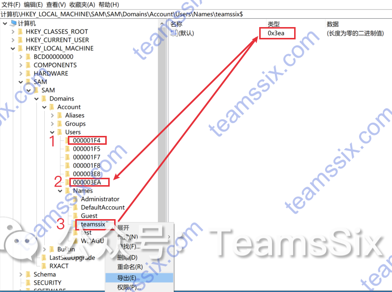 Users 下的文件名可能不太好判断归属那个用户,不过在选择 Names 下的用户时,可以看到相应的类型值,比如 teamssix$ 账号对应的是 0x3ea,那么 Users 下的文件夹就是 000003EA,同理找到管理员 Administrator 对应的是 00001F4