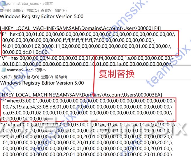 使用记事本打开导出的 Users 下的两个文件,将 Administrator 中的 F 键值内容进行替换到 teamssix$ 中