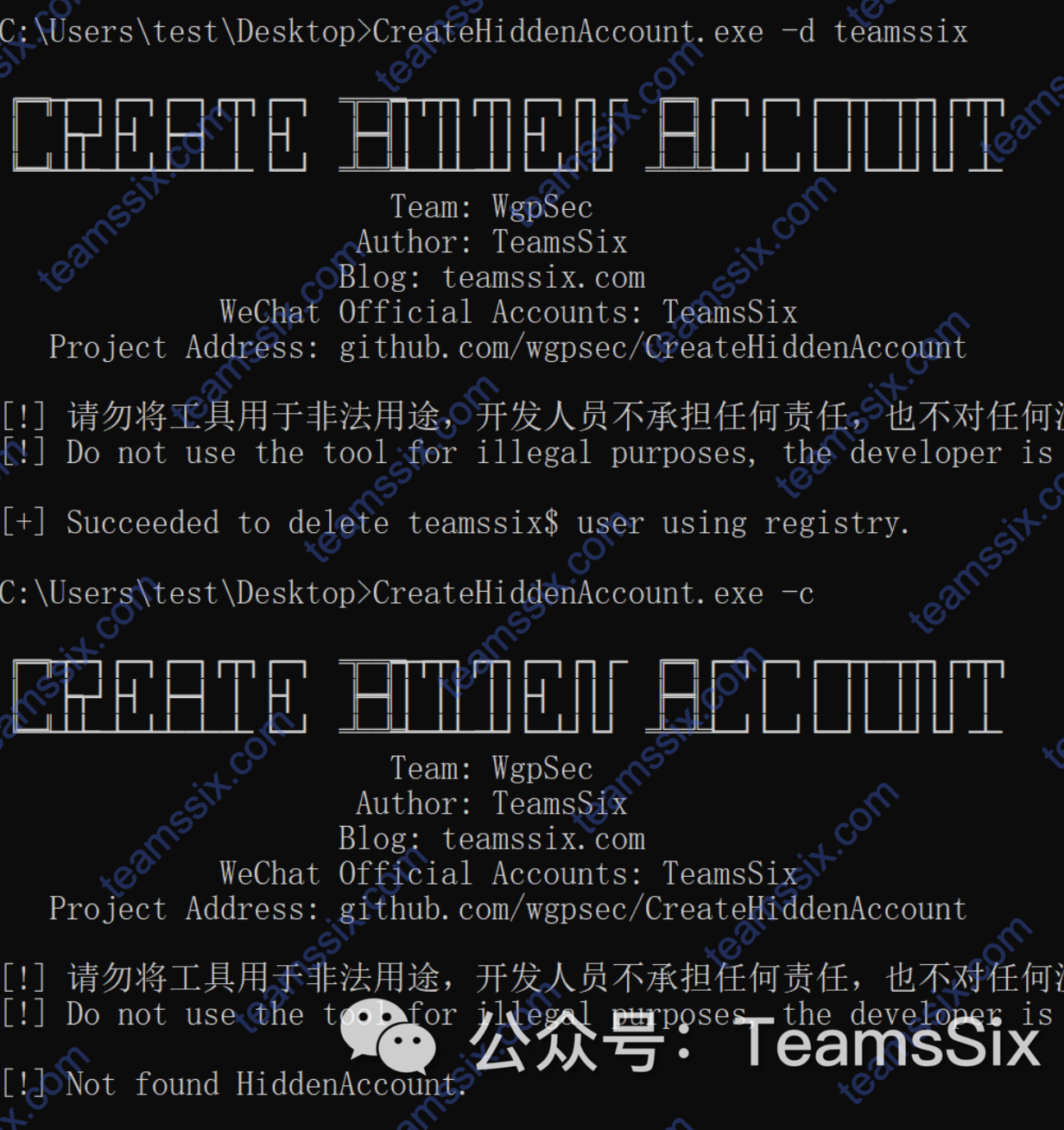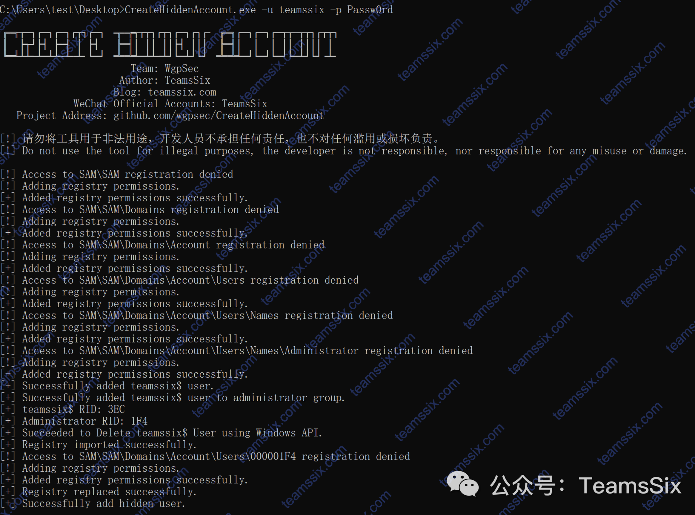 CreateHiddenAccount.exe -u teamssix -p Passw0rd